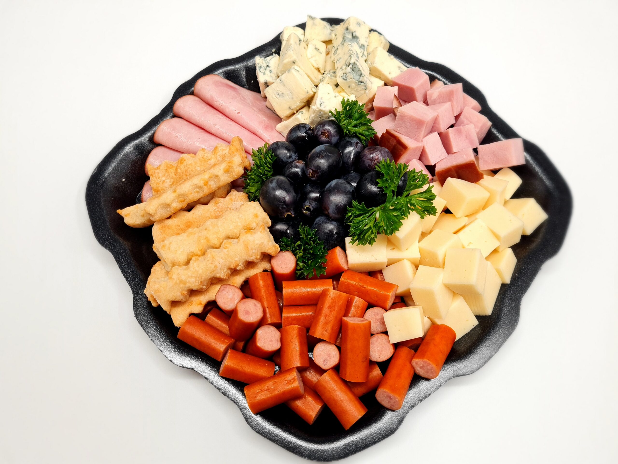 Koostisosad: täissuitsuvorst õllesigar [(sealiha, sool, tärklis, lihavalk, glükoos, vürtsid ja maitsetaimed, lõhna- ja maitseained (sh. pärmiekstrakt), stabilisaator, E450, antioksüdant: E316, toiduvärv: paprikaekstrakt, säilitusaine: E250, kollageenkest veisevalgust (kollageen, niiskusesäilitaja: E422, tselluloos, toiduvärvid: E160b, karamell)], JUUST (PIIM, juuretis, laap tardaine kaltsiumkloriid), sinihallitusjuust (PIIM, juuretis mikrobioloogiline laabi asendaja Penicillium Roqueforti), suitsu-keedusink [(sealiha 68%, vesi, kartulitärklis, sool, happesuse regulaator (trifosfaat), stabilisaator (difosfaat), paksendajad (tselluloosi sisaldav karrogeen, guarkummi, ksantaankummi), glükoos, glükoosisiirup, antioksüdant (naatriumisoaskorbaat), lõhna- ja maitseained, pärmiekstrakt, säilitusaine (naatriumnitrit), toiduvärv (ammooniumkaramell), veisevalk)] viinamarjad, keedusink [(sealiha69%, vesi, sool, dekstroos, VADAKUPULBER, tärklis, SOJAVALK, stabilisaator E450, paksendaja E407a, E425, antioksüdant E300, happesuse regulaator E451, pärmiekstrakt, säilitusaine E250)], JUUSTUküpsis, [( NISUJAHU T550, margariin (taimsed rasvad (palmi- ja kookosõli), rapsiõli, joogivesi, sool, emulgaatorid (E471 taimsest rasvast), happesuse regulaatorid E330, E500, lõhnaained, toiduvärv (beetakaroteen), JUUST 3,2% (pastöriseeritud PIIM, juuretis, laap, sool, tardaine kaltsiumkloriid), KANAMUNAD, suhkur, sool)], petersell. Võib sisaldada SELLERIT.